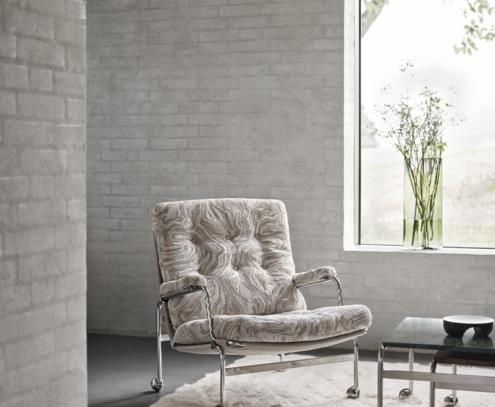 Fotel Karin 73, wywodzący się z klasycznego projektu Bruno Mathssona, oferuje eleganckie siedzisko z ramą wykonaną z pięknego chromu i głęboko pikowane poduszki.