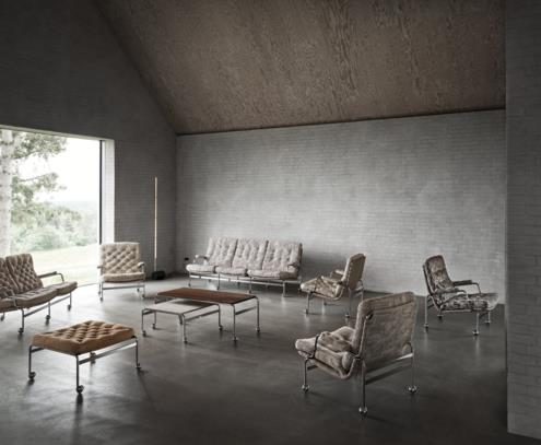 Klasyczny i elegancki fotel Karin został zaprojektowany przez Bruno Mathssona w roku 1969, stając się pierwszym meblem, w trwającej kilka dekad i niezwykle udanej współpracy. Podstawą tej stylowej kolekcji jest fotel Karin z wygodnymi, tapicerowanymi poduszkami, które spoczywają na chromowanej ramie z siatką podtrzymującą. Seria Karin obejmuje również podnóżki i stoliki.
