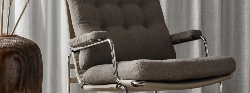 Fotel Karin, wywodzący się z klasycznego projektu Bruno Mathssona, oferuje eleganckie siedzisko z ramą wykonaną z pięknego chromu i głęboko pikowane poduszki.