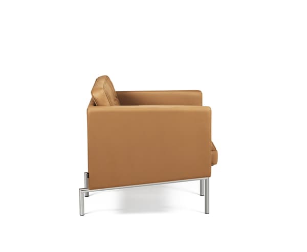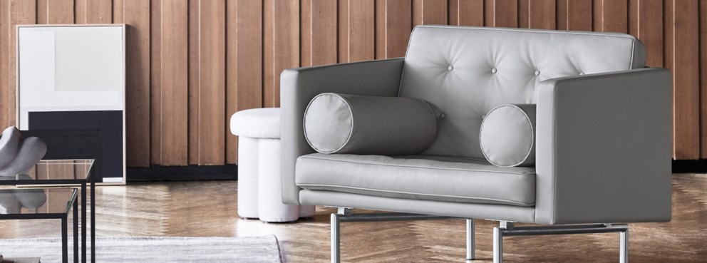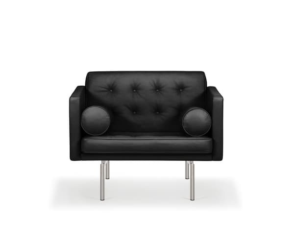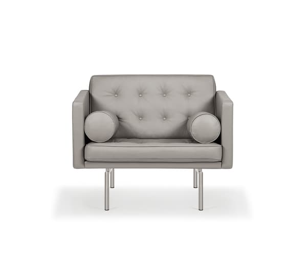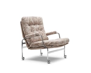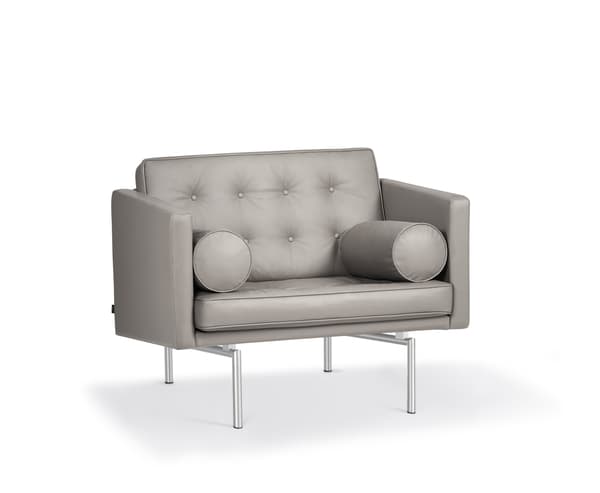 Fotel Karin, wywodzący się z klasycznego projektu Bruno Mathssona, oferuje eleganckie siedzisko z ramą wykonaną z pięknego chromu i głęboko pikowane poduszki.