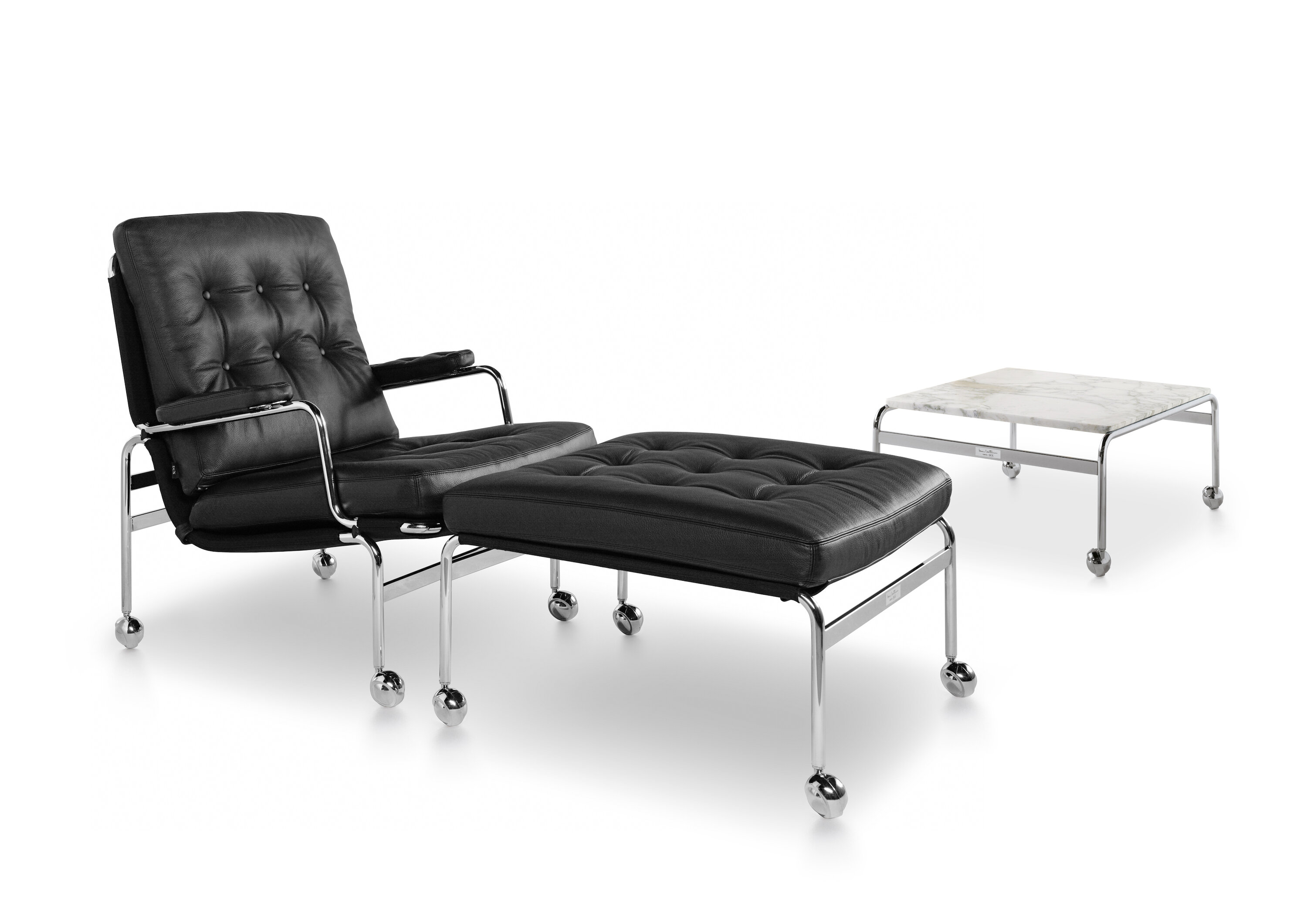 Klasyczny fotel Karin został zaprojektowany przez Bruno Mathssona w roku 1969, stając się pierwszym meblem, w trwającej kilka dekad i niezwykle udanej współpracy. Ten elegancki podnóżek stanowi nieodłączny element kolekcji. Zastosowano tutaj wypchane poduszki spoczywające na chromowanej ramie z siatką podtrzymującą, dzięki czemu zapewnia dodatkowy komfort podczas użytkowania fotela Karin.