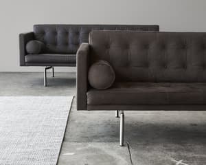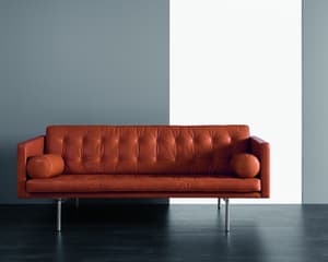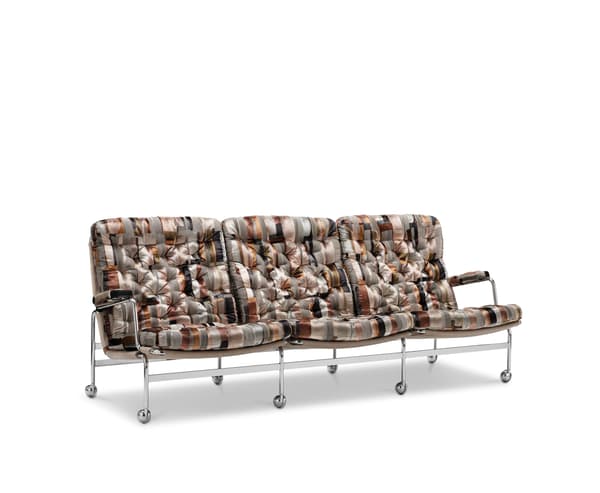 Karin 73, to elegancka 3-osobowa sofa charakteryzująca się klasycznym wzornictwem z elegancką chromowaną ramą i głęboko pikowanymi poduszkami.