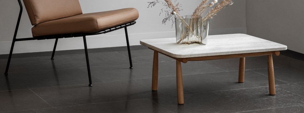 Niski stolik z ekskluzywnych materiałów idealnie pasuje do drewnianego krzesła Domus.