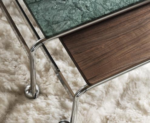Bruno Mathsson zaprojektował ten stolik jako uzupełnienie swojej klasycznej linii foteli Karin. Elegancką estetykę kolekcji Karin wyraźnie podkreśla chromowana rama, zwieńczona ekskluzywnym marmurem, wapieniem lub drewnem orzechowym.