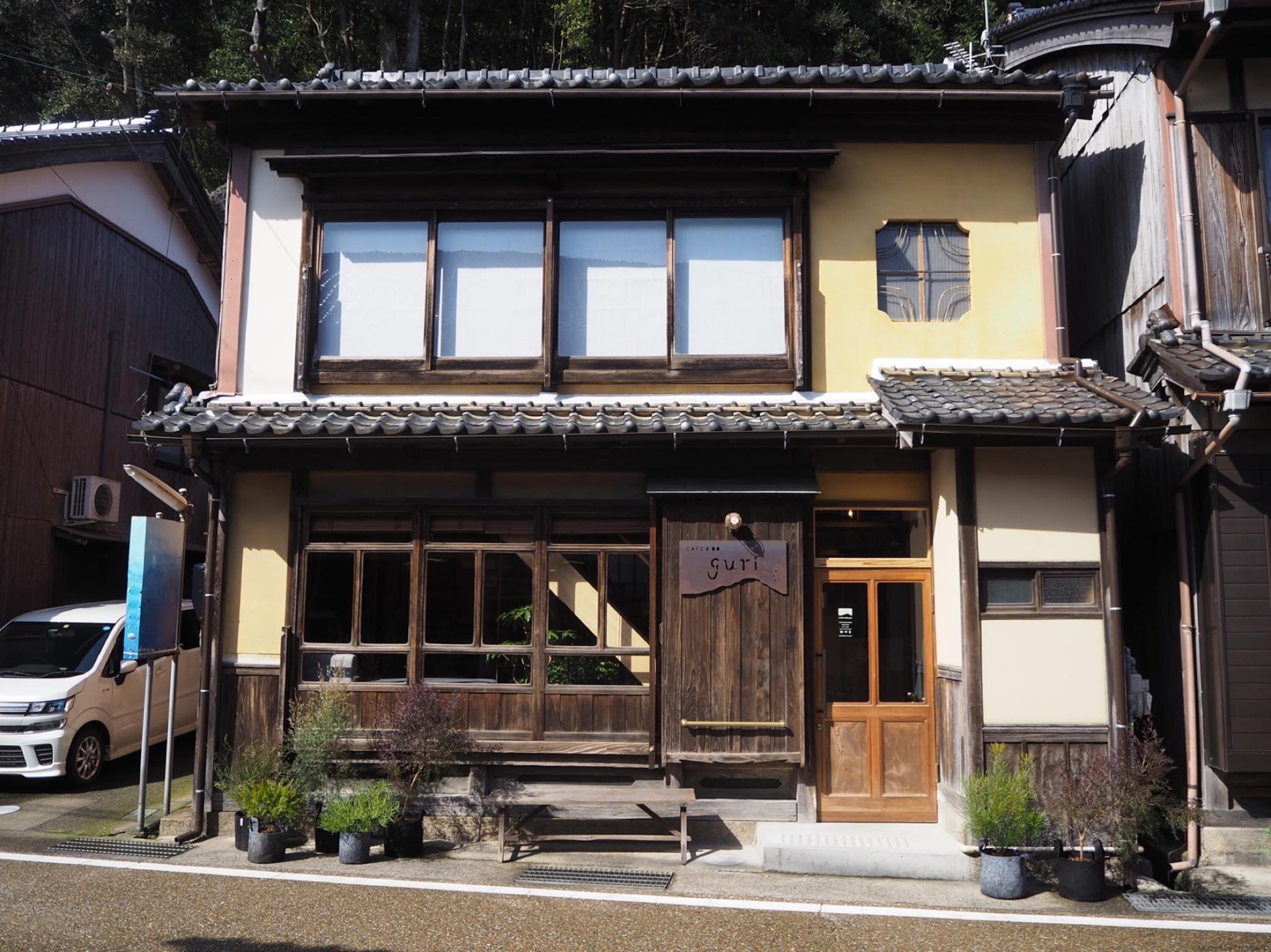 CAFE & BB guri znajduje się w Ine-cho, małej wiosce rybackiej położonej przy Morzu Japońskim, w północnej części prefektury Kioto. Guri oznacza „rafę koralową”. Ten niewielki pensjonat oferujący noclegi ze śniadaniem to miejsce, w którym podróżni i miejscowi mogą bez problemu się spotkać, tak jak ryby łączące się w ławicę w rafie koralowej.